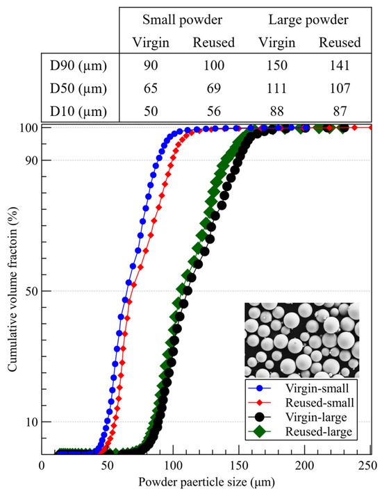 Changes in the PSD following the powder reuse process are primarily attributed to the collisions between particles and fusion with other particles [36]. During the build process, particles exposed to the heat source may experience deformation or agglomerate with adjacent particles, leading to an increase in their size. Cumulative volume fractions of the powder before and after reuse are presented in Figure 12. These results have been quantified using the upper and lower deciles (D90 and D10, respectively), along with the median (D50). The findings indicate that alterations in morphology and the PSD are highly dependent on the initial size of the powder in its virgin state. For the smaller particles, the reuse of powder resulted in an increase in the D10 value, with a more pronounced increase observed for the D90 value, indicating a general increase in the particle size after powder reuse. In contrast, for the larger powder particles, the D10 value remained relatively constant after reuse, suggesting minimal changes in the smaller particle sizes within this condition. However, the decrease in the PSD as it approached D90 reflected a slight reduction in the larger particle sizes. This inverse trend observed in the large powder particles was likely attributed to sieving through a 100-mesh sieve after each cycle, which removed agglomerates formed by the fusion of particles. These observations highlight the distinct effects of powder reuse on the PSD depending on the initial particle size, i.e., small versus large powders. The reuse of powder may induce aggregation or coalescence in smaller particles while potentially breaking down or reducing the size of larger particles. All these changes in morphology and the PSD affect flowability and can lead to defects such as LOF or porosity within the deposited part.