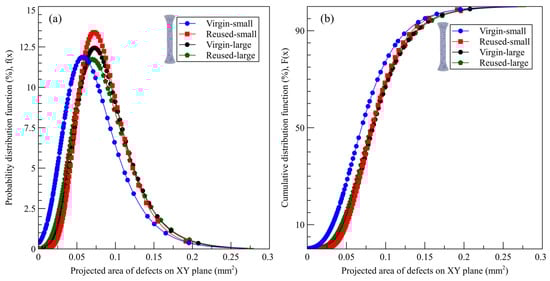 (a) Probability density function and (b) cumulative distribution function using extreme value distribution (Gumbel) for detecting defects in specimens fabricated using powders with small and large particle size distributions (PSDs) before and after reuse.