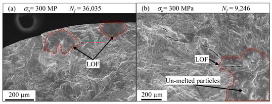 Figure 14a,b show the fatigue fracture surfaces of the specimens fabricated using virgin–small and reused–small powders, respectively. In nearly all specimens, irrespective of the powder type, LOF defects were the primary sources of crack initiation. In wrought metals, cracks typically initiate from microstructural defects such as dislocations, grain boundaries, inclusions, and pores, especially in the absence of significant surface discontinuities. However, for AM metals, process-induced defects like gas pores and LOF predominantly drive crack initiation [75]. In high-cycle fatigue (HCF), the most severe void—characterized by its size and irregularity—near the surface often dictates fatigue life, with a single dominant crack usually propagating to failure. While multiple crack initiations are possible in HCF, typically, one crack becomes predominant. However, in AM metals with high porosity or closely packed pores, multiple defects are likely to initiate cracks even at lower strain/stress levels (i.e., HCF). The interaction of these closely spaced defects creates overlapping local stress fields, leading to substantial plastic deformation and potential crack initiation from multiple sites. Consequently, crack initiation and propagation may transition from being dominated by the largest void to being influenced by multiple defects, even under HCF conditions.
