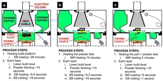 Samples were produced by conventional PBF-EB as well as by variations of NIR-assisted PBF-EB in the Arcam S12 system modified according to a previous publication [47] and equipped with a 6 kW NIR heater [47]. The different variants of NIR assistance for each experiment are described in Section 2.2.1 and Section 2.2.2.