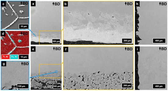 Cross section of the lower part (a,b) of one sample manufactured on top of a build platform, with a higher-magnification image of the microstructure (c) and EDX mapping results for the same region (d). Cross section of the lower part of one sample manufactured without a build platform (e,f), with a higher-magnification image of the microstructure, where the Widmanstätten structure is visible at the very bottom of the build (g). Cross sections showing the surface roughness of samples manufactured with a build platform (h) and without a build platform (i).