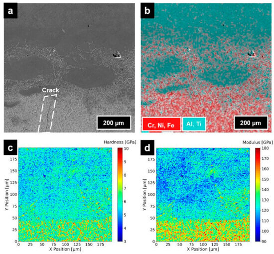 Figure 4a,b further show how the contamination was distributed throughout the lower part of the samples built on top of a build platform. As can be seen from the EDX map in Figure 4b, the contamination was quite evenly distributed in the lower region of the sample and gradiently decreased as the build progressed, where some islands of cleaner Ti-6Al-4V appeared before moving into “uncontaminated” material. Cracks were observed in the contaminated areas, one example of which is shown in Figure 4a. Nanoindentation (Figure 4c,d) confirmed that the mechanical properties were skewed close to the build platform and would decrease the performance of any part manufactured in this region. The low parts of Figure 4c,d show significantly harder and stiffer material where the contamination is present. It is likely that this increase in hardness in combination with defects between Ti-6Al-4V and the 304 stainless steel resulted in the cracks originating in the interface at the build plate. An interesting note is that no cracks could be observed in the quasi-platform case, even though there were plenty of possible initiation sites, as shown in Figure 3f. A less likely contribution to the cracks may be made by oxygen pickup close to the build plate [52].