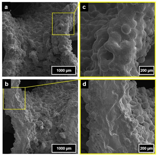 SEM view from the lower side of triply periodic minimal surface lattices manufactured without a build platform (a) and with a build platform (b), as well as close-ups of the bottom surfaces of these (c,d, respectively).