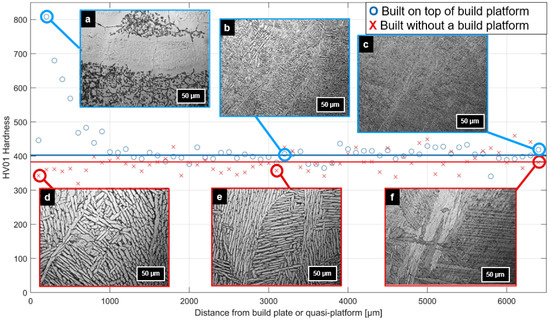 Vickers HV01 hardness plots of samples built on a build platform and on a quasi-platform overlaid by microstructural images of each sample at various heights (a,b,c and d,e,f respectively). The horizontal lines spanning the plot correspond to the average bulk hardness of the sample built on top of a build platform, 403 HV01 (standard deviation: 20), and the sample built without a build platform, 383 HV01 (standard deviation: 29). The bulk hardness was calculated from the average between 2000 and 6000 µm from the build platform.