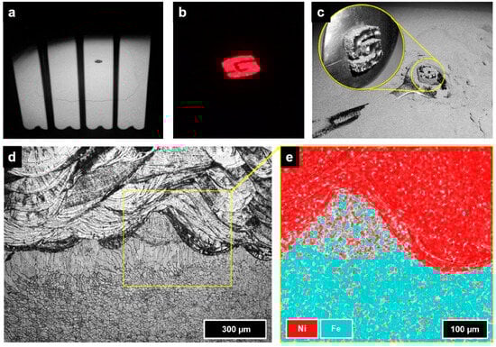 The brief sintering of the loose powder bed (4 min) allowed a powder cake to form, as shown in Figure 7a. However, as shown by the emittance in Figure 7b, the main heat was confined to the spoon and melt area, which seemed to absorb more of the NIR energy. Figure 7c shows the teaspoon with the logo built on top, as it was removed from the build chamber. As can be seen in Figure 7d, the “repair” was successful in fusing the two materials on a microstructural level. The fine, equiaxed microstructure of the teaspoon was mostly preserved up to about ~100 µm from the interface, where columnar grains formed towards the 316L material. These columnar grains were likely the result of a slight remelting of the spoon surface and later annealing with a directional heat flow away from the heated area (top). The preservation of the original microstructure in the lower section indicates that an optimized process could be tuned to unite the two material structures, as PBF-EB is known for good microstructural control [43,60,61,62]. The EDX analysis of the transition in Figure 7e utilized the fact that 316L has a higher Ni content than 304 stainless steel. By overlaying the Fe signal with the Ni signal, the mixing of compositions throughout the transition can be estimated. This indicates that in some areas the transition was direct, and in some areas the two alloys were mixed together and created a gradient transition, as shown in Figure 7e.