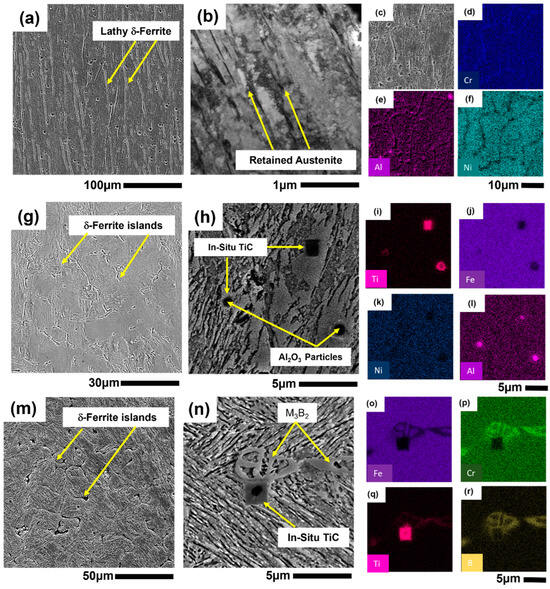 Figure 1 illustrates the microstructural characteristics of the non-inoculated and TiC/TiB2-inoculated samples. Figure 1a–f represent the micrograph and EDS maps of the non-inoculated sample, revealing Cr-rich δ-ferrite in lathy and vermicular forms. This retention at room temperature is due to the high solidification rate of the WAAM process and the high Cr content (~13 wt.%) in the alloy, which acts as a ferrite stabilizer [4]. The TEM image shown in Figure 1b depicts a lath martensitic matrix with retained austenite, resulting from the presence of approximately 8 wt.% Ni, which acts as an austenite stabilizer and inhibits the complete transformation from austenite to martensite during cooling. Additionally, the EDS map in Figure 1e identifies Al-rich oxides, likely originating from the shielding gas, ambient air, or residual moisture. For more comprehensive information on the microstructure of WAAM-fabricated PH 13-8Mo parts, refer to the authors’ recent publications [3,5].