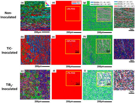 (a–c) IPF maps, (d–f) their corresponding phase maps, and (g–i) their corresponding grain boundaries’ misorientation maps for the non-inoculated, TiC-inoculated, and TiB2-inoculated samples, respectively.