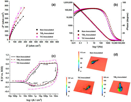 Confocal microscopy (Figure 3d) was employed to further analyze the corrosion effects on the samples following cyclic potentiodynamic polarization tests. The TiC-inoculated samples exhibited minimal pitting, with pit depths significantly shallower than those found in other samples, indicating superior resistance to localized corrosion. This finding aligns with their enhanced electrochemical stability demonstrated in previous tests.