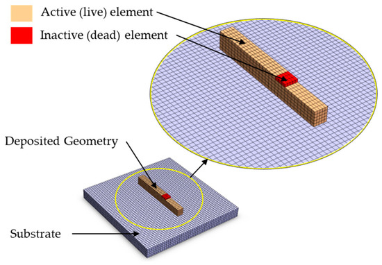 To simulate the sequential addition of material in the W-DED process, the element birth and death technique was employed [35]. This technique allowed for the activation (birth) and deactivation (death) of elements to replicate the physical process of material deposition and the corresponding thermal history (Figure 3).