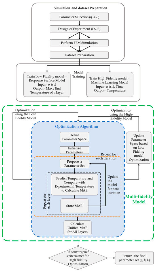 This initial phase was crucial for establishing the foundation for further modeling efforts. Subsequently, a response surface model (RSM), the low-fidelity model, was constructed based on the data derived from the DOE. The LF collaborated with a machine learning (ML) model, the high-fidelity model, to predict the target values and ascertain the most effective settings. The primary objective was to align the simulation results with actual experimental data and to identify the optimal settings. These parameters were then employed in the simulation model to derive the temperature distribution generated by the simulation, which served for the validation of the model to confirm its accuracy and reliability in determining the optimal parameters. An illustration of the MF calibration process of the W-DED simulations is presented in Figure 4.
