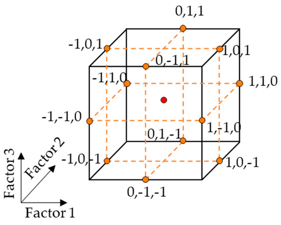 To systematically explore the parameter space, a DOE approach was implemented in our study. Among the various DOE methodologies available, the three-factor Box–Behnken design (BBD) [36] was selected for its notable efficiency in navigating experimental space with a reduced number of simulations (Figure 5). This choice was driven by the need to balance the depth of the parameter exploration with practical considerations, such as resource limitations and time constraints. The BBD was particularly advantageous for this study due to its ability to provide sufficient data for the development of a robust model without the extensive number of runs compared to a full factorial design (FFD) or the potential edge-of-range issues associated with the central composite design (CCD).