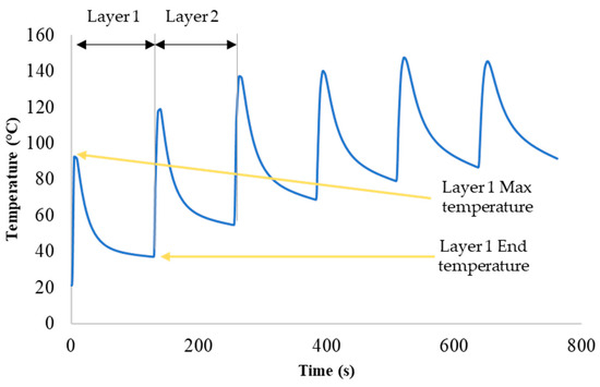 Typical temperature profile versus time plot for thin-wall W-DED deposition.