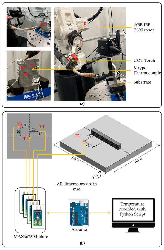 Four K-type thermocouples were used with a MAX6675 Module to obtain temperature readings at T1, T2, T3, and T4 locations. T1, T3, and T4 were positioned on the back side of the substrate, while T2 was located on the welding side. All thermocouples were set at a safe distance of at least 10 mm from the center line of the deposition. This arrangement was chosen to protect the thermocouples from heat damage and interference from the deposited material. An Arduino microcontroller was utilized to interface with the thermocouples and acquire temperature data, while temperature logging was performed using a Python script. The thermocouples had a temperature range spanning from 0 to 1024 °C. Direct contact between the thermocouples and the substrate was ensured to maintain accuracy in temperature measurements. Deposition parameters are detailed in Table 1.