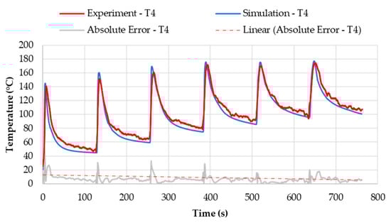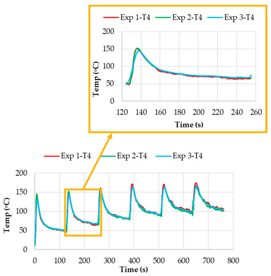 To demonstrate the reliability of our experimental data, the experiment was repeated multiple times. Figure 8 presents a comparative analysis of the temperature-over-time plots at the T4 location across three trials, all of which show strong consistency. In this study, the temperature readings from the T1 and T4 thermocouples were used because these locations were closest to the welding line.