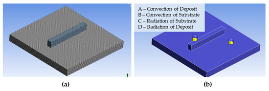 To accurately simulate the thermal environment of the W-DED process, specific boundary conditions were defined. The initial temperatures of the materials were established at ambient levels. Throughout the thermal analysis, the effects of convection and radiation between the surface and the surrounding environment were considered and modeled using the following equations: