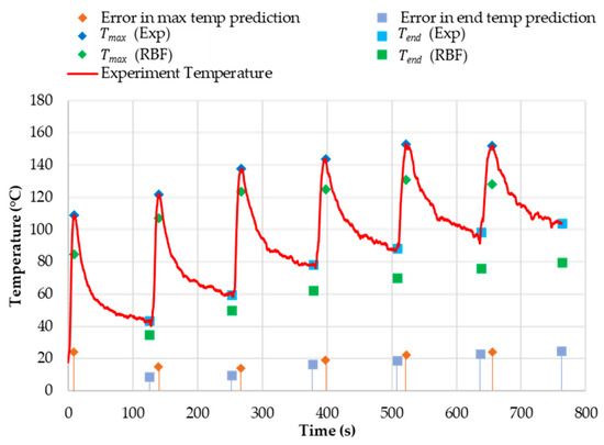 In the early phase of calibrating the W-DED simulation, a RSM was used based on the radial basis function (RBF) interpolator with a thin-plate spline kernel as the LF model. This kernel was particularly suited for our purposes, as it provided a balance between flexibility and smoothness in interpolation. RBF was perfect for the initial stages because it could rapidly evaluate the simulation parameters while using minimal computing power. The LF model was trained using data from the set of simulations prescribed by the DOE strategy that explored different combinations of key parameters, including η, h, and ε. This dataset (DLFM) captured the maximum temperature (Tmax) and the temperature at the end of the dwell time (Tend) for each deposited layer and will be available in the Supplementary Data (Figure 6).