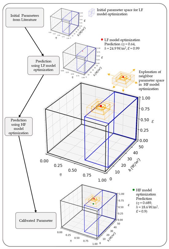 The GP served as a probabilistic surrogate to approximate the function g(x), employing the Matérn covariance function to ensure smooth variations in MAE in response to minor changes in the parameters (η, ℎ, and ε) [40,41]. The optimization process was guided by the expected improvement (EI) acquisition function, which aims to maximize the expected reduction in MAE [42]. This function was crucial for identifying potential improvements through adjustments in η, ℎ, and ε based on the observed temperatures. After each function evaluation, Bayesian inference was used to update the GP model, integrating new data to refine MAE predictions. This update highlighted the impact of each parameter on the observed temperatures. After each evaluation of the objective function, the GP model was updated using Bayesian inference, integrating new data to refine the MAE predictions. This update accounted for the impact of each parameter, i.e., η, ℎ, and ε, on the observed temperatures.