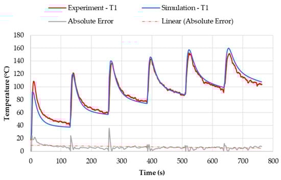 These components were integrated within a FEM software environment (Ansys R2 (22.2)), executing a numerical simulation that yielded the temperature field, T. The field varied with time, t, and spatial coordinates (x, y, z) and was governed by the 3D nonlinear heat transfer equation, expressed as follows [31]:
