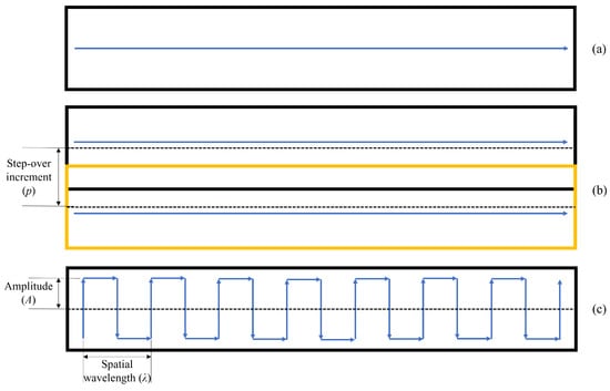 This study consisted of three separate experimental setups for the deposition of simple-linear, overlapping, and oscillating beads, and it was conducted on separate substrates. Firstly, eight simple-linear beads (Figure 1a) were produced. The TS was kept constant, and the WFS and electric current systematically varied. Secondly, overlapping beads were made (Figure 1b). Two single beads were overlapped with constant welding parameters, with an overlap distance ranging from 3 to 5 mm in 0.5 mm steps. Finally, an oscillating bead path (Figure 1c) characterized by a square waveform was employed, a piecewise linear function that was described by alternating horizontal (x-direction) and vertical (y-direction) segments, forming a square wave-like path when plotted. This function was not continuous but consisted of linear segments that created a regular, repeating structure. The pattern was defined by the G-code, which directed the welding torch to alternate its position along the x-axis while moving forward incrementally along the y-axis. In this final set of experiments, the amplitude and the spatial wavelength of the wave path varied, while the WFS, TS, and current were constant and identical to the settings of the second experiment.