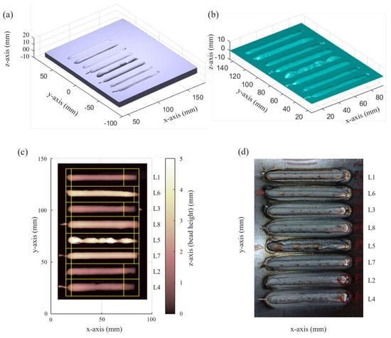 Figure 2 shows the first, second, and third steps described in Section 2.3 in relation to the morphological analysis of simple beads before extracting them from the substrate. Figure 2b presents one of the experimental plates after rectifying the bending deformation of the substrate because of heat transfer, and Figure 2c shows the projection onto the XY plane and the delineation of each bead. The x-limits of each bead varied according to whether the assessment encompassed all the bead sections or excluded the initial and terminal segments of the bead.