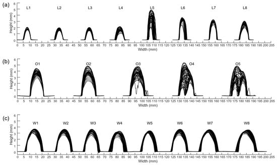 All cross-sections were overlaid, to study the progression of a bead along its length. This technique was used to obtain qualitative data of the uniformity of bead height and width, and it was used as an indicator of quality. Figure 3 presents bead cross-sections. The sections that met the three criteria outlined in the fifth step of Section 2.3 are drawn.