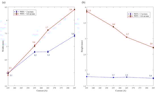 Bead width (a) and height (b) as a function of the printing current for the two WFSs.