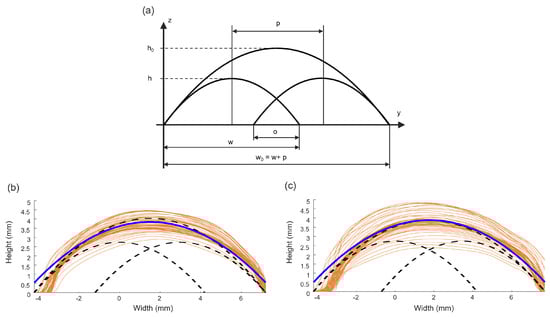 and are the theoretical sections corresponding to the overlapping linear beads; is the resulting section after the overlap. Similarly, h and w represent the original height and width, respectively, of the single linear beads and , the height and width result after the overlap. The simple-linear bead chosen by using the specified deposition parameters was, therefore, bead L3 (see Table 3). Figure 5b,c show the actual bead cross-sections in comparison with the theoretical parabolas derived from beads O1 and O2. Figure 5a is the schematic diagram that illustrates the theoretical model of the overlapping beads, where w is the width of one bead, p is the distance between the peaks of the two overlapping beads (i.e., the overlapping length), o is the overlap distance, is the total distance of the resulting overlap, h is the height of each bead, and is the height of the resulting overlap. Figure 5b,c are plots that compare the theoretical model (which is shown in solid blue and black dashed lines) with actual data (which are shown by multiple thin orange lines that represent the different cross-sections along the overlapped beads). In these figures, the x-axis represents the width and the y-axis represents the height. The blue solid line indicates the theoretical height profile of the overlapping beads; that profile is a parabola, which was estimated using the least squares method for all the experimental sections. This line should be compared to the theoretical one, which is the black dashed line corresponding to the profile after the overlap. The black dashed lines represent the theoretical single beads that overlap, thus producing the single overlapped bead. The orange lines represent the multiple data sets obtained from the cross-section of the overlapping bead.