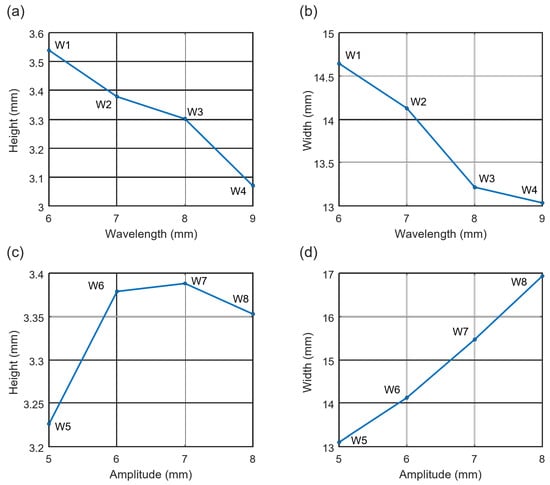 Height and width versus oscillating parameters: wavelength and amplitude. (a) Height vs. wavelenght; (b) width vs. wavelength; (c) height vs. amplitude; (d) width vs. amplitude.