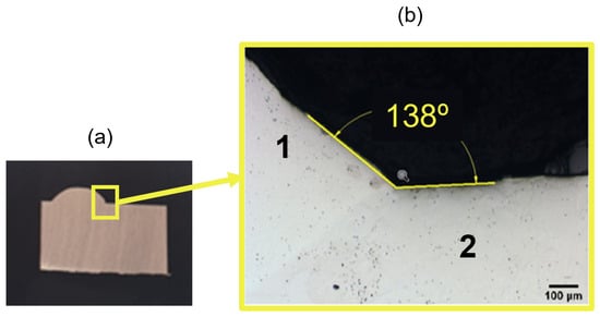 Figure 7 shows some measurements whose wettability angles () were gathered in the last column of Table 3, Table 4 and Table 5, respectively, for each set of experiments. Figure 7a exhibits a representative sample of all the conducted measurements, comprising a cut cross-section and embedded into bakelite for its microscopy analysis. Figure 7b corresponds to a magnification of Figure 7a, indicated by the yellow square, measured by optical microscopy.