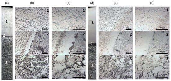OM analysis of beads L3 (a–c) and L5 (d–f): (a,d) stitching of the bead–substrate assembly, where three areas can be appreciated (1—stainless-steel AISI316L deposited bead, 2—bead–substrate interface, and 3—carbon steel substrate); (b,e) zoom of each region acquired with a 40× optical lens; and (c,f) zoom of the regions acquired with a 100× optical lens.
