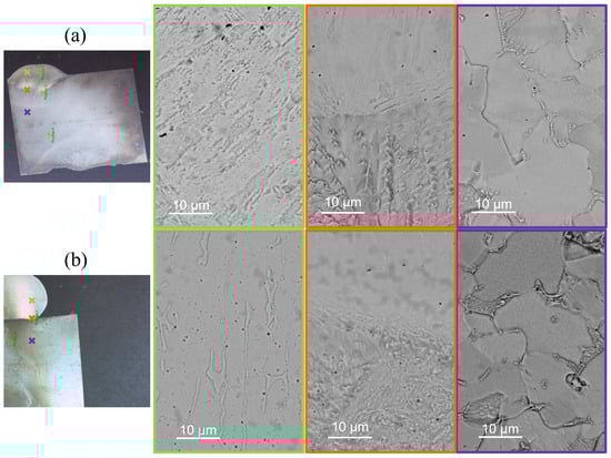 SEM images of bead–substrate assemblies in L3 (a) and L5 (b) simple-linear beads. In each subfigure, the green colour represents the measurement point on the weld bead, the orange colour represents the point on the interface, and the purple colour represents the point on the substrate, as indicated by the colored crosses in the bead-substrate assembly on the left.