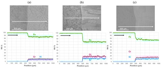 Figure 10 shows EDX line scans of beads L4, L5, W8, (a), (b), and (c), respectively, with the content of the main alloying elements (i.e., Fe, Cr, and Ni). The profiles were taken from the bottom, the AISI1040 carbon steel substrate, throughout the interface to the AISI 316LSi bead. Furthermore, there were sharp transitions among materials ranging from 50 μm to 100 μm. The highest energy bead (L4) had less transition length than the lowest (L5), being W8 length in the middle of both. The line profiles indicated a sharp decrease in Fe content and a corresponding increase in Cr and Ni levels around the 500 m position, where the transition between carbon steel and stainless steel occurred. For L4, the transition was sharp, indicating a well-defined interface with minimal interdiffusion, due to the higher heat input. This resulted in a distinct composition. In contrast, L5 exhibited a more gradual transition, suggesting a broader diffusion zone at the interface. The lower current combined with the higher WFS likely caused faster deposition and more melt pool turbulence, leading to increased intermixing between the bead and the substrate. This more gradual transition may have contributed to the wavy interface observed in L5’s micrographs. W8, which shared the same current as L4 but with a higher WFS, showed a transition profile that fell between L4 and L5, with a moderately defined interface. The sharper transition compared to L5, but not as sharp as L4, suggests that the combination of higher current and faster WFS in W8 led to a balance between distinct compositional boundaries and some intermixing at the interface.
