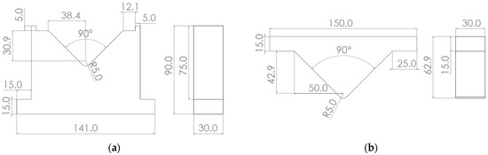 The die and punch sets were produced with two different orientations—horizontal and vertical—to evaluate their effects on the bending performance. The punch and die were designed to achieve a 90° bend in the AISI 304 stainless steel sheets. The die features a V-shaped cavity with a radius of 5 mm at the base. The punch is designed to complement the geometry of the die. It has a similar V shape with a 90° angle at the bottom and a radius of 5 mm, matching the die’s curvature, as shown in Figure 1. Both the punch and die were designed for 3D printing using Fused Filament Fabrication (FFF) technology, and each dimension was chosen to be at least one order of magnitude larger than the layer height to prevent any potential damage arising from a loss of accuracy due to the production process. Since in the bending process established in this research, the sheet will never contact the lowest part of the die, the die radius was set to 5 mm to prevent any stress concentration due to potential tool deformation. The die and punch were designed for two printing orientations: horizontal (Sample H) and vertical (Sample V). Both tools were printed using an infill that consists of alternating layers with a density equal to 100% and an orientation equal to 45° and −45°. The wall layer thickness was set to 2 layers, and the layer height was 0.1 mm for both configurations.
