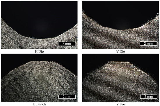 A comparison of the surface structures of the horizontally and vertically printed die and punch samples.
