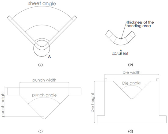 From the digital files, the following measurements were obtained for the sheet: three internal angles were measured at different distances from the bending area—near the bending area, in a middle zone, and at the end of the sheet (Figure 4a). Additionally, five thickness measurements were taken in the bending area to monitor the sheet’s behavior during bending (Figure 4b). For the punch and die, single measurements of their height, width, and angle were taken before and after use in production to ensure that the printed components matched the design specifications (Figure 4c,d).