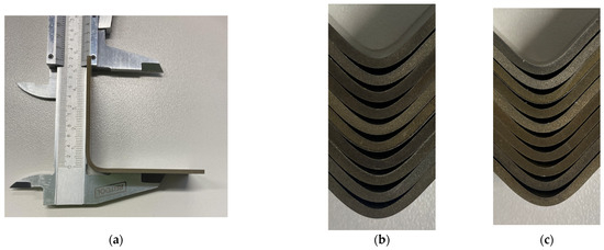 This section presents the main results of the sheet analysis. A visual inspection confirmed that all sheets were produced with high accuracy, successfully achieving the desired bending angles. For instance, Figure 5a illustrates the 10th sheet produced using vertically oriented tools. Additionally, all sheets were assembled for further inspection. Figure 5b,c display the sheets in numerical order from lowest to highest. The inspection revealed that all sheets were correctly produced with no visible defects, abrasions, or cracks in the bending areas or any other sections.