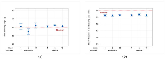 Figure 6 illustrates the individual value plot of the sheet-bending angle as a function of the sheet number and tools’ orientation on the print plate.