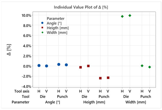 The main results related to the geometry measurements acquired for the punch and die tools after the sheet-bending process are illustrated in Figure 7 and detailed in Table 4. To correlate all measurements, the value Δ is introduced as the percentage deviation of the measured value with respect to the CAD.