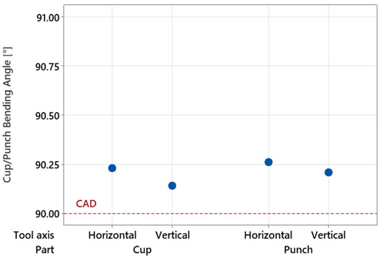 The findings of this study provide a comprehensive comparison of the bending performance and durability of tools printed in horizontal and vertical orientations. As presented in Figure 8, the graph depicting the bending angles of the 10th and final bent cups, along with the final states of both the horizontally and vertically printed punches, shows that both orientations exhibit bending angles slightly above the target of 90 degrees. The increase in the bending angle is attributed to the compression of the punch height during the bending process. Since the sheet is always in contact with the punch during bending, as the punch height decreases, the punch angle increases, resulting in a corresponding increase in the sheet’s bending angle. As shown in Figure 8, the vertical punch and the corresponding sheet exhibit values closer to the CAD geometry. However, when observing the y-axis, the precision achieved is within a range of tenths of millimeters.