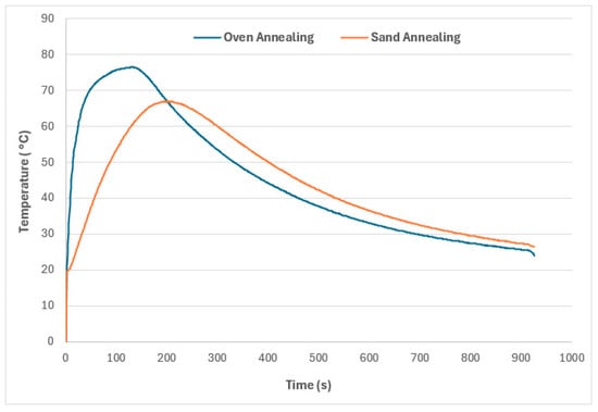 For annealing, the samples were placed in the oven according to the specified annealing methods and subjected to the designated temperature and duration. After the annealing time elapsed, the oven was turned off and the samples were left to cool inside the oven until they reached room temperature. The first method was conventional annealing, where the samples were placed on a tray (L × W × H; 300 mm × 210 mm × 40 mm) and placed in the oven at a specified temperature, then allowed to cool after the time has elapsed. The second method was fluidized bed annealing with sharp sand (will be referred to as sand annealing), and the samples were submerged in the sand bed to be uniformly annealed. The tray was filled with sand to a height of 30 mm and the samples were placed midway deep in the sand. For this work, sharp sand was used, which typically contains larger particles with angular edges. The angular shape of the particles in sharp sand allows for better contact between them, which promotes more efficient heat transfer. The two annealing methods present a different way of heating the samples and each method offers unique advantages in terms of heat transfer and temperature control, with the controlled cooling process playing a crucial role in minimizing residual stress and enhancing mechanical properties.