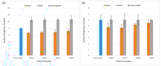 The FFF-printed composite samples were submerged in sand and placed in a tray to be annealed inside an oven. Contact with sand could have adverse effects on the surface roughness of the samples due to abrasion. Moreover, the layer-by-layer nature of the FDM process introduces distinct layer lines, which exacerbate the challenges associated with achieving a smooth surface finish [12,35,36]. Therefore, this test was performed to assess the impact of varying annealing conditions and contact media on the surface roughness of the composite samples. For this purpose, a Surftest SJ-210 (Mitutoyo, Kawasaki, Japan) contact-type surface profilometer was used and all the samples were measured with the traverse direction being diagonally across the building direction at an angle of 45°. The average surface roughness (Ra) values measured along the length of the samples are shown in Figure 2.