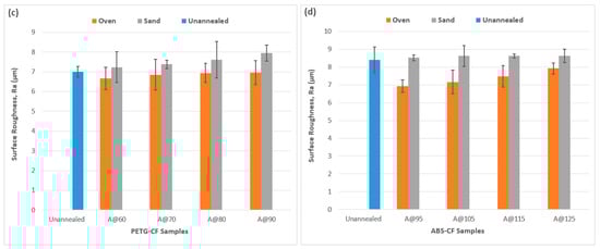For PETG-CF (Figure 2c), the oven annealing values were consistent but only slightly lower than unannealed samples. The lowest value of 6.6 μm (compared to 7 μm for unannealed samples) was observed at 60 °C, meaning that the surface roughness of PETG-CF samples was not significantly affected by annealing. Surface roughness values for sand annealing were higher than oven annealing and kept increasing with high temperatures, with a value of 7.9 μm at 60 °C. ABS-CF (Figure 2d) showed better surface finish due to better layer adhesion at lower oven annealing temperatures. However, higher temperatures led to an increase in roughness values due to uneven shrinkage and fiber movement. The lowest value of 6.9 μm and the highest value of 7.9 μm (compared to 8.4 μm for unannealed samples) were observed at oven annealing temperatures of 95 °C and 125 °C, respectively. Sand annealing surface roughness values were consistent and comparable to annealed samples. It is clear from these results that oven annealing at lower temperatures is better suited for good surface finish because it offers more controlled and uniform heating, leading to fewer thermal gradients, reducing warping and uneven surface textures [19,20,21]. On the other hand, the abrasive nature of sand and contact with sand grains cause inconsistencies on the surface of the samples during sand annealing, leading to poor surface finish.
