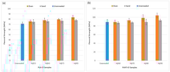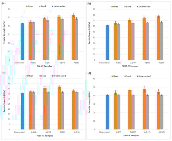 Annealing is an established post-process used to improve the tensile properties of thermoplastics [19,20,29] and this work is comparing two different methods to ascertain the impact on the tensile strength of four carbon fiber composites. The results of the tensile testing are shown in Figure 3. Both methods demonstrated higher values compared to unannealed samples, highlighting the positive effects of annealing. Figure 3a shows a gradual increase in tensile strength with increased annealing temperatures for both methods. However, the increase is more significant in the case of oven annealing compared to sand annealing. The highest values were observed at the highest temperature of 83 °C, indicating that the heat helped in relieving internal stresses and promoting better layer bonding [19,34]. An increase of 23.2% was observed for oven annealing at 83 °C, compared to unannealed PLA-CF. On the other hand, an increase of 13% was observed for sand annealing at the same temperature, highlighting the effectiveness of oven annealing. A similar pattern was observed for PAHT-CF (Figure 3b), with the tensile strength increasing with increased annealing temperature. Polyamide benefits from annealing-induced crystallization due to improvement in crystallinity and stabilization of the internal structure [37]. The highest increase was observed at 90 °C as 26% for oven annealing, compared to unannealed PAHT-CF. The increase in tensile strength for sand annealing was only 8.6% at the same annealing temperature. These results show the effectiveness of oven annealing to increase tensile strength for the two semi-crystalline materials.