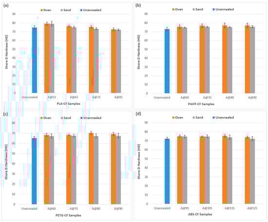 Oven annealing has been shown to impact the surface hardness of thermoplastics [29,38]. However, sand annealing with the irregular contact and abrasive nature of the sand could lead to different results. Therefore, it is crucial to assess the hardness of the four composites to ascertain the effects of the two annealing methods. It is to be noted that annealing temperatures and time intervals can affect the hardness values. An average of five values were taken from each square sample, equidistant from each other. The results of Shore D hardness are shown in Figure 4. It is evident that annealed samples for both methods showed higher values compared to the unannealed ones, indicating the positive effect of annealing.