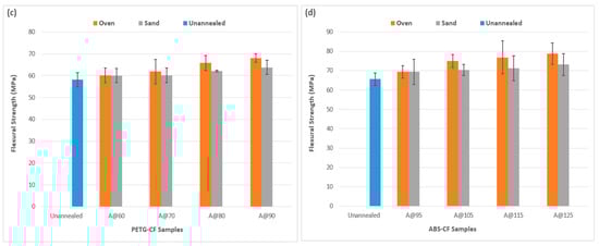 Three-point flexural testing has been used in this work to ascertain the flex or bending properties of the FFF-printed composites. The results from the testing are shown in Figure 5. All annealed samples showed higher values compared to their unannealed counterparts [38]. It is to be noted that oven annealing yielded higher flexural strength compared to sand annealing in all cases and the values increased with rising annealing temperature. For PLA-CF (Figure 5a), an increase of 17.3% was observed at the highest annealing temperature of 83 °C, compared to the unannealed samples. On the other hand, sand annealing only showed an increase of 9.2% at the same temperature. This is a common theme in flexural testing for all materials. Oven annealing demonstrated an increase in flexural strength with rising annealing temperatures, but the increase is less significant compared to oven annealing. This can be attributed to the uniform heat distribution that allows for better bonding between layers and stress relief during oven annealing. However, sand annealing can present varying thermal conductivity and inconsistencies due to uneven sand distribution, leading to less reliable improvements. Figure 5b showed that the flexural strength of PAHT-CF samples increased by 21.3% (at the highest annealing temperature) compared to unannealed PAHT-CF samples, whereas sand annealing only showed an increase of 8.2%. At the highest temperature of 90 °C, annealed PETG-CF samples (Figure 5c) showed an increase of 17% and 9.6% for oven annealing and sand annealing, respectively. Annealed ABS-CF samples (Figure 5d) showed the highest increase of 20% at 125 °C for oven annealing as opposed to 11.4% for sand annealing, compared to unannealed samples. These results indicate the effectiveness of oven annealing for enhancing the flexural strength of FFF-printed carbon fiber composites.