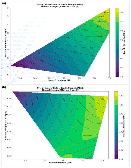 Overlay contour plots for PETG-CF: (a) oven annealing; (b) sand annealing.
