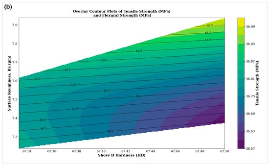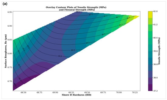 Sand annealing is superior to oven annealing in terms of maintaining dimensional integrity (except PLA-CF). However, if the focus is shifted to exclude dimensional stability as it is a serious issue for all the oven annealed materials (except PLA-CF), then the outcome would be different. Figure 7 shows the overlayed contour plots for the amorphous material PETG-CF. This material delivers smooth and consistent print quality. The addition of carbon fiber enhances mechanical properties by providing a unique texture and significantly improved strength. These features make it especially well-suited for high-stress applications where both durability and a premium surface finish are critical. Typical examples include protective casings and automotive interior components such as mounts and brackets. For a PETG-CF product, consider a maximum surface roughness of 7.4 μm, tensile strength of over 36 MPa, hardness of over 75 HD, and flexural strength of more than 87 MPa. In this case, all the oven annealing scenarios fulfil the requirements, as opposed to only two sand annealing scenarios (at 70 °C and 80 °C), making oven annealing the obvious choice. This analysis plays a crucial role in quantifying the results, enabling users to understand the limitations of the two annealing methods for different materials. By identifying the best practices, users can achieve optimal results tailored to specific applications, thereby improving the efficiency and performance of the manufacturing process.