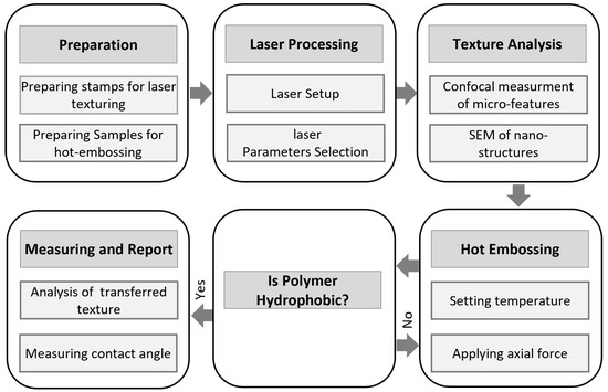 To overcome these challenges, laser processing technology proves to be an effective technique for producing surfaces with nano- and micro-structures [9,10]. During the laser ablation process, the target material absorbs laser energy, melts, and evaporates, which causes morphological changes inside and around the ablation area [11]. Through the laser ablation process, different structures can result in hydrophobicity [12]. In one study, hydrophobicity on AISI 430 stainless steel was achieved in three laser patterns: octagonal donut patterns, ellipses at 90° angles, and a dimple array. The structure of ellipses at 90° angles showed a contact angle of 98° [13]. Both the structure type and the laser parameters are extremely important in producing hydrophobicity. The surface transitioned from hydrophilic to hydrophobic and eventually became superhydrophobic when laser processing was conducted at the highest repetition rate [14]. The stability of hydrophobicity on laser-textured surfaces is another criterion that is influenced by the laser fluence. It is shown that structured surfaces achieve stable hydrophobic conditions when the peak fluence exceeded a threshold, resulting in final contact angles above 140°. Conversely, when the fluence was below this threshold, the surface initially became hydrophobic, reaching a maximum contact angle, but its hydrophobicity diminished over time [15]. Although direct laser processing is a promising technique compared to other methods to produce hydrophobicity, the process represents some surface damages and it is still not an economical method for some industrial application. In the direct ablation process of polymers, a significant amount of energy is absorbed by the material, leading to heating, boiling, vaporization, and the formation of pores. These pores observed that the following laser ablation can be attributed to the rapid cooling of the superheated melt after intense boiling [16]. The presence of pores can negatively impact the performance of a final part, particularly if it is intended for use in harsh and abrasive environments. Therefore, the selection of laser parameters significantly influences the final performance. For instance, in terms of hydrophobicity, polymers exhibit different responses to various laser parameters. For example, PEEK displays varying contact angles depending on the laser wavelength: untreated PEEK has a contact angle of 92.4°, and laser treatment yield angles of 59.5° at 1064 nm, 131.0° at 532 nm, and 52.5° at 355 nm [17]. Therefore, a much more robust process is desirable. Combining laser processing with other methods, for example, hot embossing could be an alternative for producing hydrophobicity. Hot embossing is an intriguing process due to its ability to replicate fine micro- and nano-scale details with high precision and cost-effectiveness compared to other microfabrication techniques. It accommodates a variety of thermoplastic materials and can be scaled from small to large production volumes, making it suitable for industrial manufacturing. The process enhances material properties, such as lubricity. Advances in hot embossing technology have reduced cycle times and improved efficiency, enabling faster quicker production and lower costs [18].