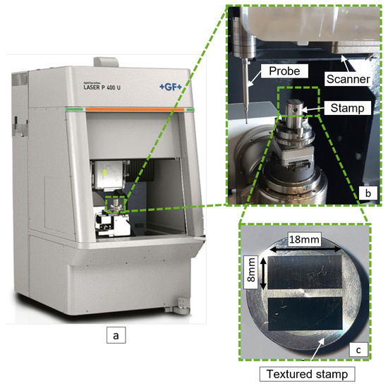 The laser source employed was a solid-medium type known as Carbide-Model (CB3-40-0200-10-HB) from Light Conversion Company, Lithuania, with a wavelength of 1064 nm. The intensity profile of the laser beam was near-Gaussian (M2 < 1.2), and the beam spot size (2w0) was 22 µm. The laser system generates different infrared pulse widths, including tp = 750 fs, with a maximum average power output of 40 W. The laser source has been integrated into a 5-axis machine (+GF + LP400U), as shown in Figure 2a. The laser spot is positioned on the workpiece in nominal focus distance (F.D). The focus distance was kept in the nominal value of the F-theta lens equal to 100 mm. The used material is a disc (Ø28 × 12 mm) from stainless steel DIN1.4301 (Cr:17.5 to 19%, Ni: 8 to 10.5%, C < 0.07%_ Si < 1.0%_ Mn < 2.0%_ Pb < 0.045%_ S < 0.015%), which was machined before the laser machining. The initial surface roughness of the stamp and polymer workpieces was assessed using a tactile measurement instrument (Hommel-Etamic T 8000 by Jenoptik), with values of Ra = 1.38 µm (Rz = 7.79 µm) and Ra = 1.62 µm (Rz = 6.86 µm), respectively. A confocal microscope (NanoFocus Mobile µsurf) was used to measure the geometrical micro-features of the laser textures.
