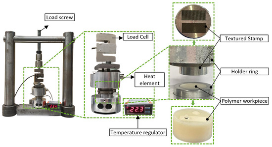 In the hot-embossing setup (Figure 4), the stamp is positioned inside a holding ring which is connected to a load cell for measuring the axial force applied on the stamp by a load screw. A heating element was also inserted in the holding ring to provide the required temperature for the stamp. The temperature was also controlled via a regulator to ensure that the working temperature does not exceed the defined threshold. The temperature range was selected below the melting point of the polymer (Table 2). A holding time of 60 s was applied for all the workpieces during the hot embossing process. To determine the range of the hot-embossing parameters, some screening tests were conducted, and based on the initial results, the parameters in Table 3 were adopted. To measure the contact angle on the polymer workpieces, an optical analysis system (DataPhysics—OCA 200) with distilled water was utilized. The water volume used to measure the contact angle was between 7 and 8 µL.